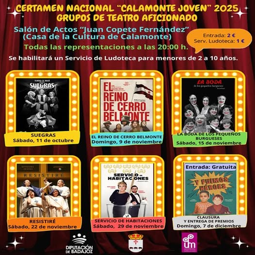 El Ayuntamiento de Calamonte presenta las obras seleccionadas en el Certamen Nacional Grupo de Teatro Aficionado “Calamonte Joven 2025”. La representación de estas obras seleccionadas será en los meses de octubre y noviembre del 2025 en el salón de acto “Juan Copete Fernández” de la Casa de la Cultura de Calamonte y tendrá el broche final en el mes de diciembre con la Clausura y la entrega de premio.