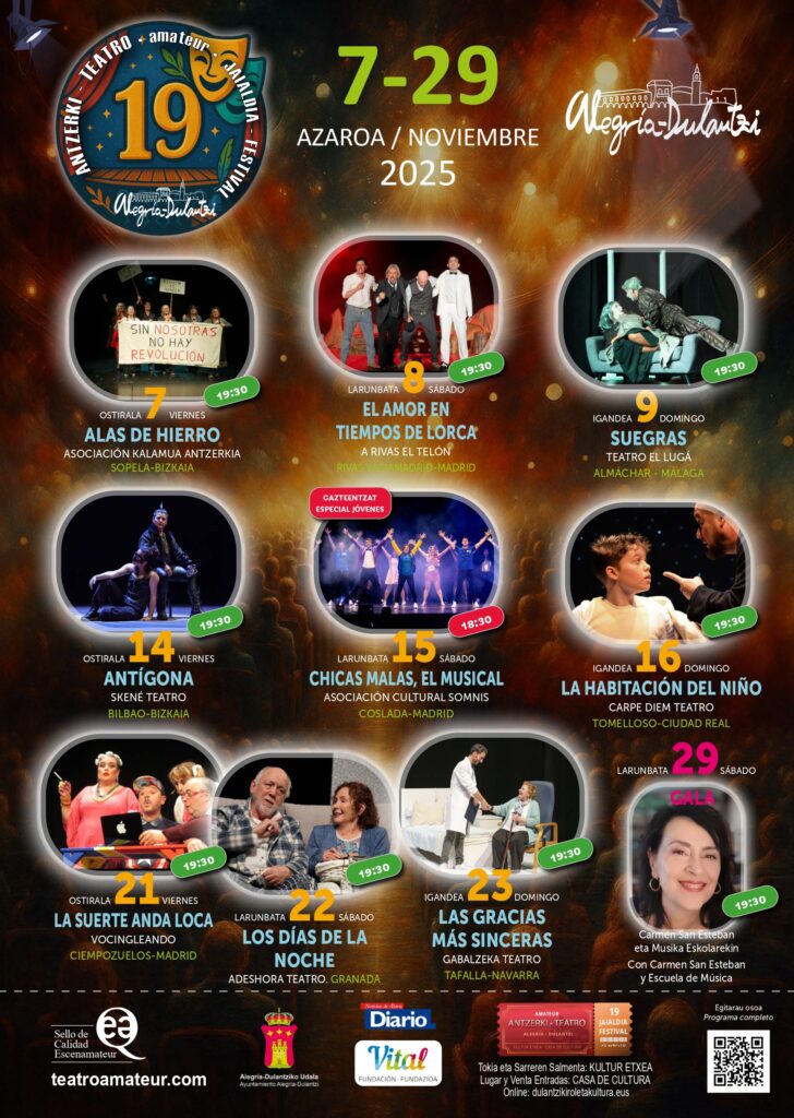 El festival se cerrará el sábado 29 de noviembre con una gala de clausura, en la que se reconocerá el trabajo y la creatividad de los grupos participantes, poniendo el broche final a una cita que, edición tras edición, sigue demostrando que el teatro amateur continúa muy vivo en Alegría-Dulantzi.