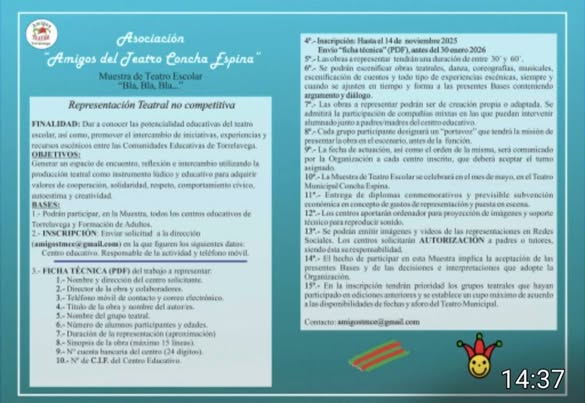 La Asociación Amigos del Teatro de Torrelavega ha convocado la IX Edición de la Muestra de Teatro Escolar “BLA, BLA, BLA”, una iniciativa dirigida a los estudiantes de Educación Infantil, Primaria, ESO, Bachillerato, Escuelas Oficiales de Idiomas y Centros de Adultos de la ciudad.