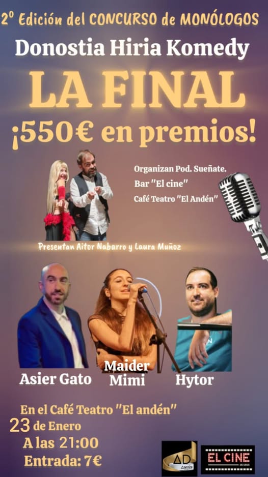 Este jueves 23 de enero a las 21:00 horas, el Café Teatro El Andén se llena de humor con la gran final de la 2.ª edición del Concurso de Monólogos Donostia Hiria Komedy.